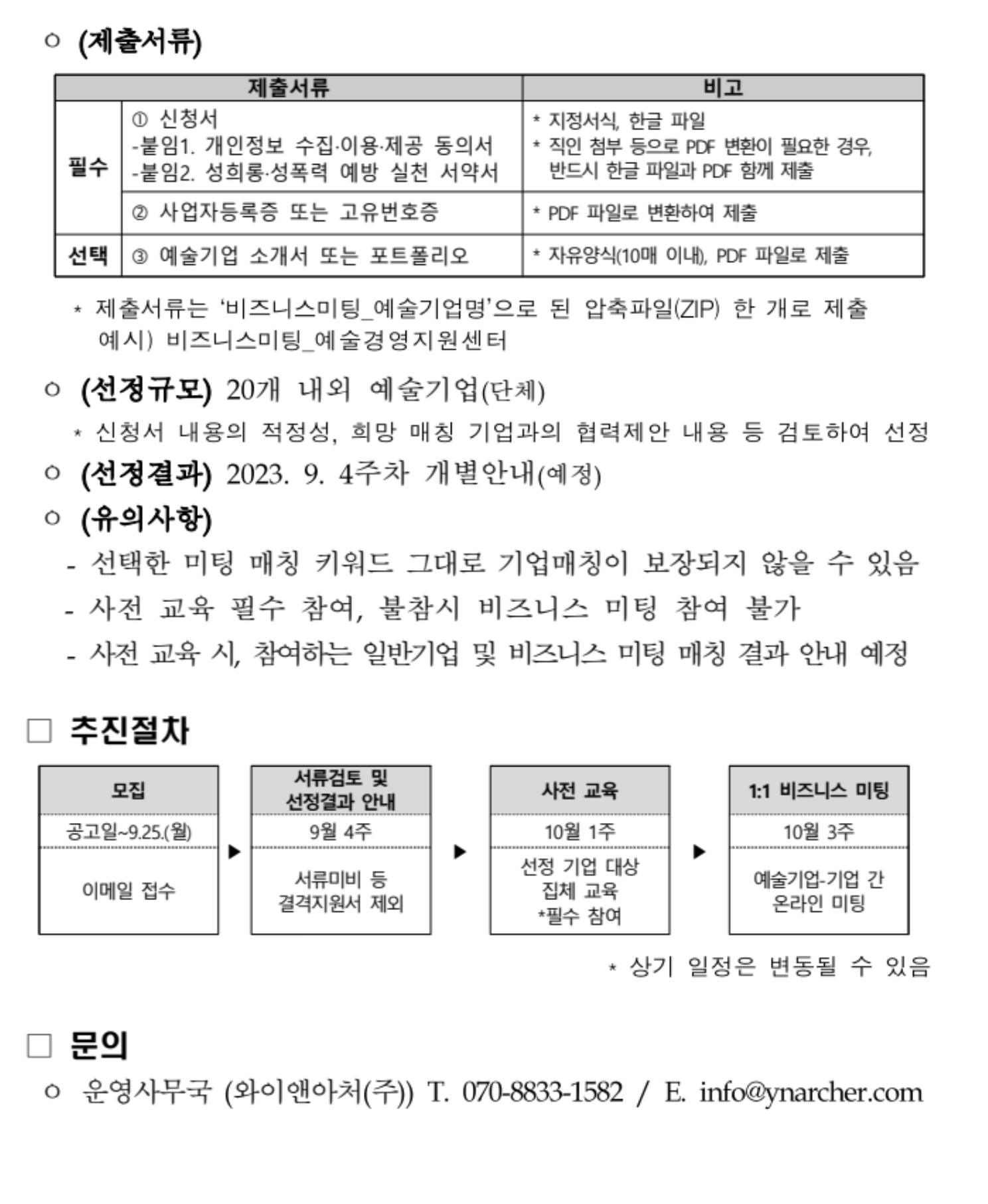 - 신청대상 일반기업과 협업 또는 네트워킹을 희망하는 예술기업 (*사업자등록증 또는 고유번호증 보유 필수)
